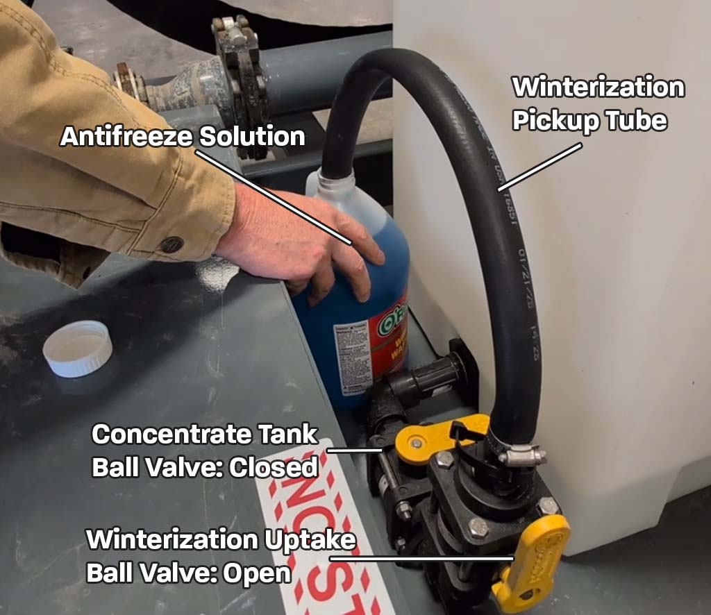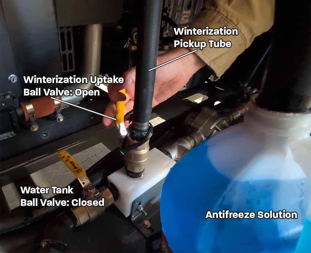 • Open the winterization ball valve—this allows fluid to be sucked in from the gallon jug.